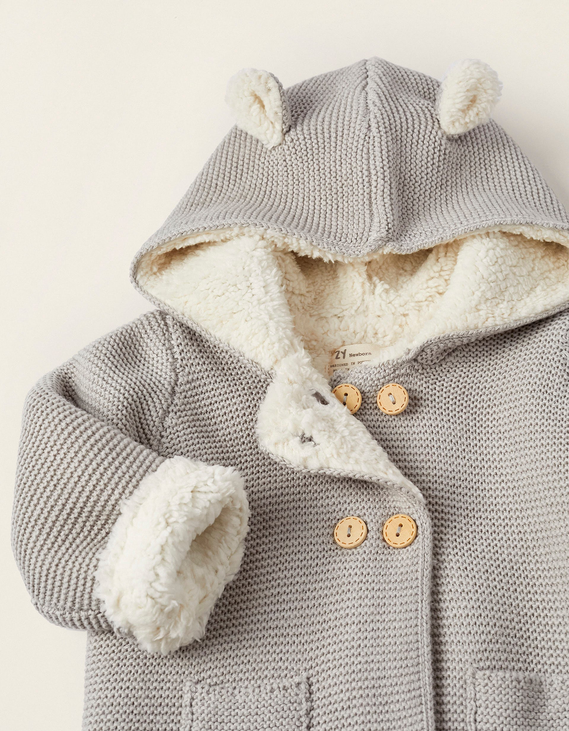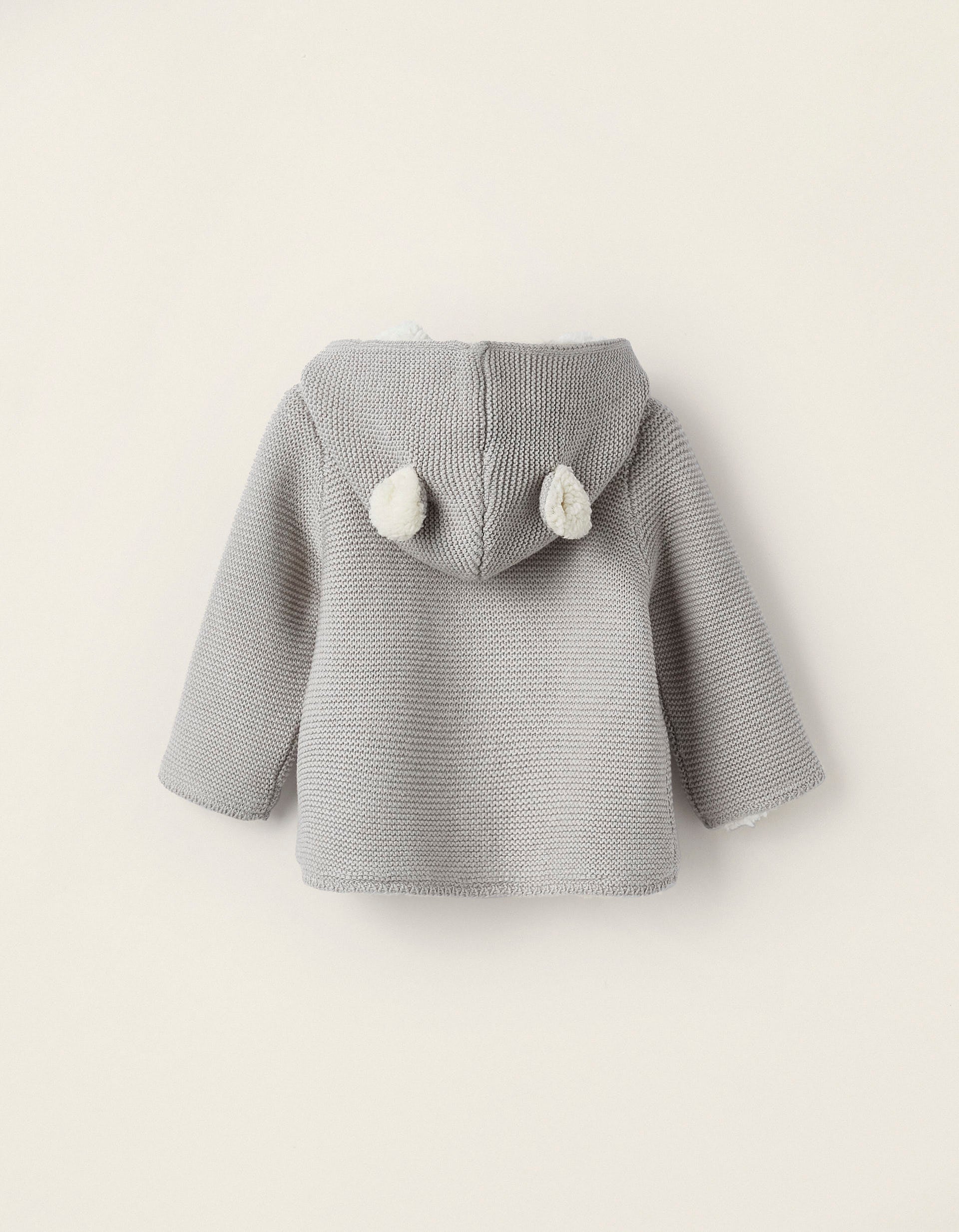 Hermosa chaqueta para bebé en tejido de punto color gris marca Zipotazo, desde 0ms hasta 9-112ms, materiales antialérgicos, forrada en algodón, capucha con orejas muy tiernas